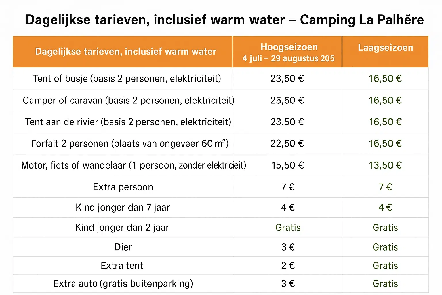 Tent or Van (2 people, electricity) | 23.50 € | 16.50 € |