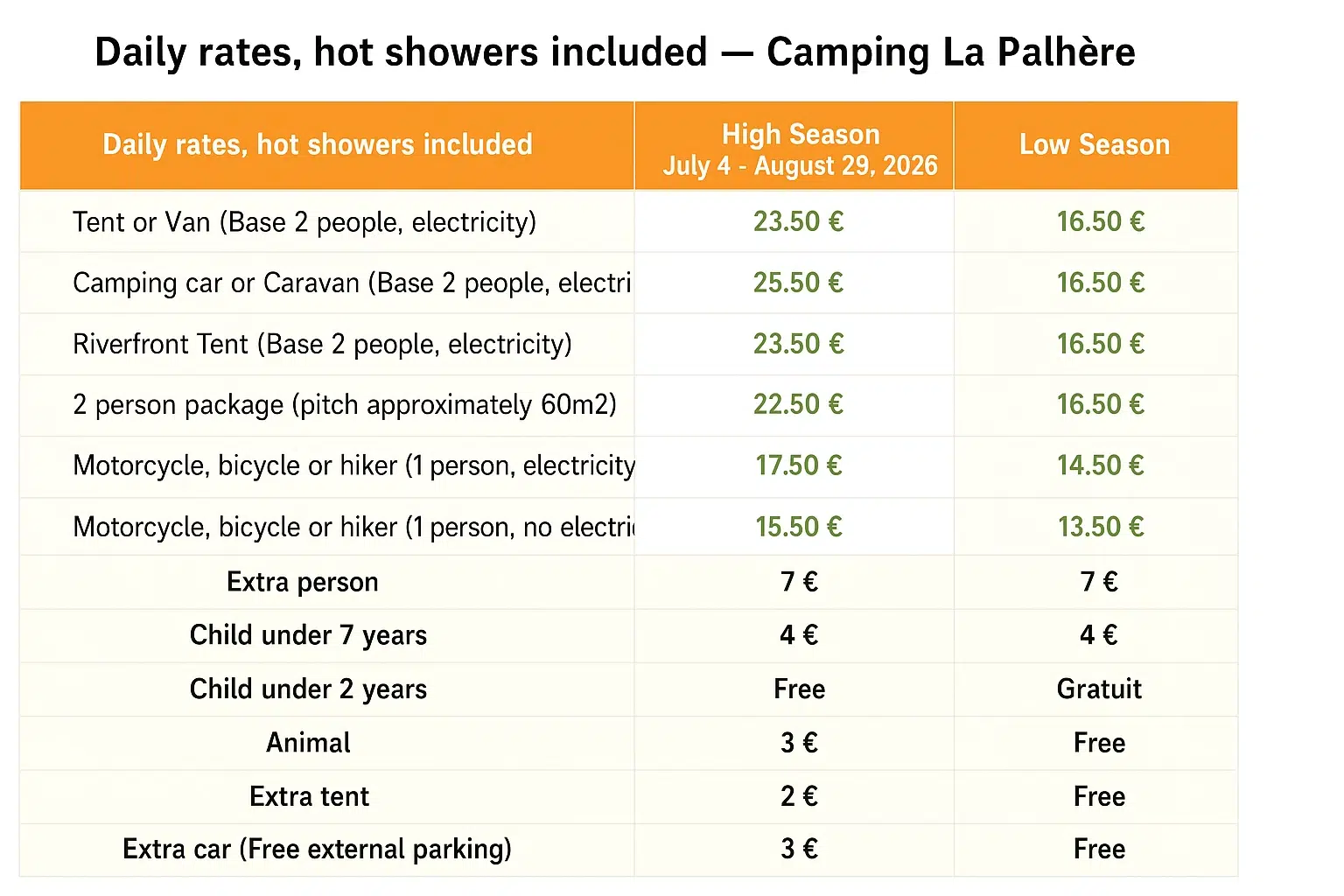 Dagelijkse tarieven, warm water inbegrepen | Hoogseizoen 4 juli - 29 augustus 2026 |